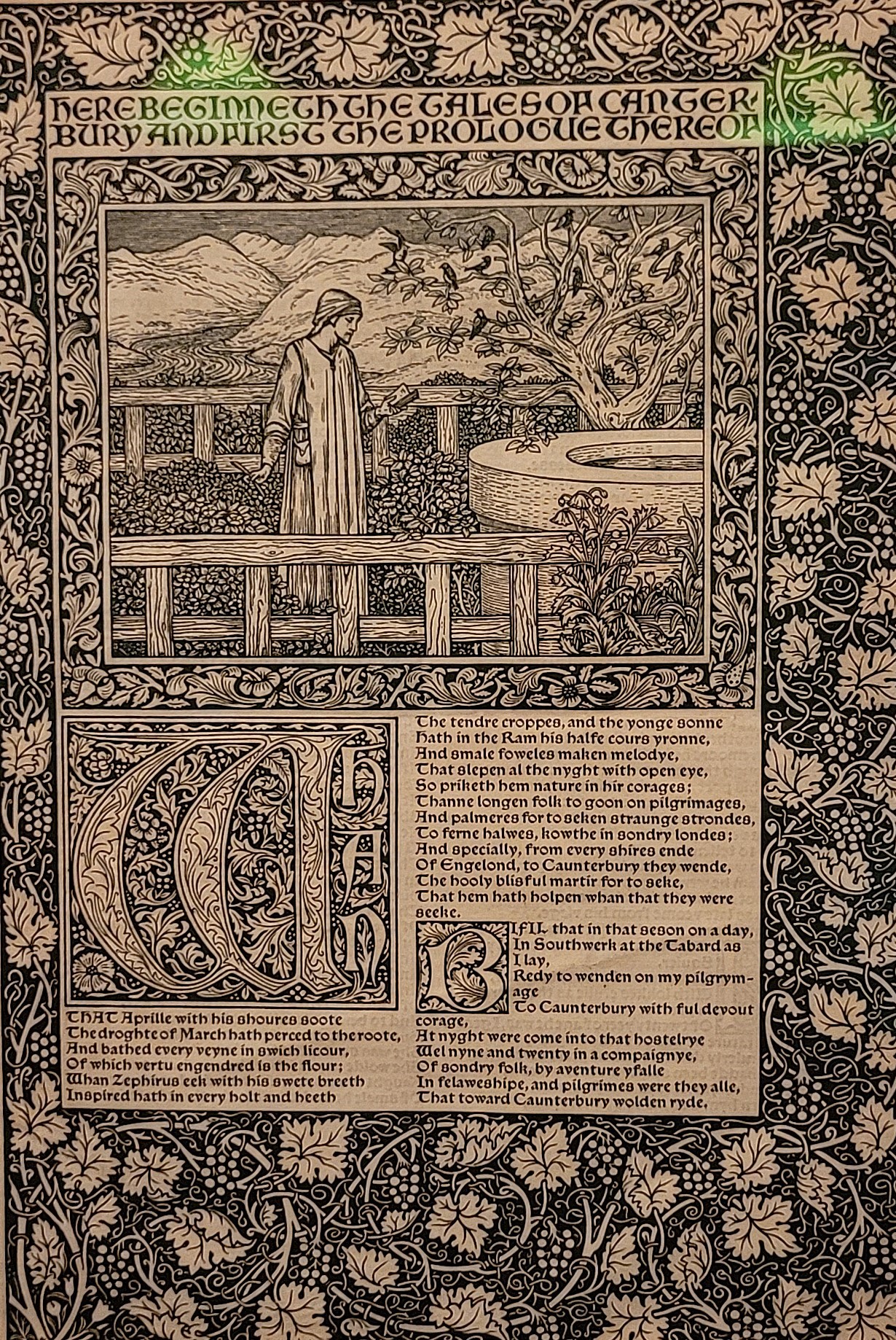 In his time, Morris remained true to his vision and never knowingly sold his soul for financial returns, despite expanding the business through grand retail shops and seeking international recognition for the company. He was a prodigious writer – and ironically, was actually more famous in Victorian times for his writings rather than his art. This seems incredible today, when indeed Morris Mania has led his designs to be seen everywhere; anywhere and on anything… Kelmscott Press enabled him to design his own type and print beautiful work, as ever in line with his fascination for a pure brethren – the ideal community of traditional craftsmen and story-tellers. This did remind me of J.R.R Tolkien – and I was interested to learn that Morris’ poems and writing on myths and legends were indeed a significant influence on the younger writer.
